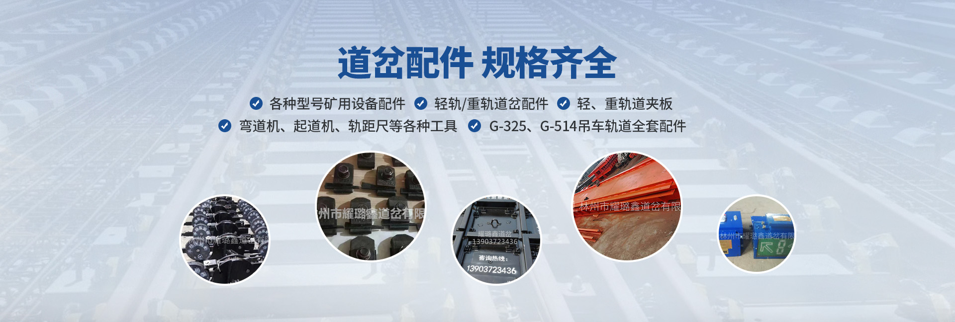 各種型號礦用設備及配件;輕軌道岔、重軌道岔及配件;各種型號輕、重軌道夾板;輕軌、重軌線路用彎道機、起道機、軌距尺等各種工具;G-325、G-514吊車軌道全套配件。